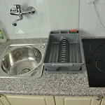Place was fairly clean, with convenient location. I loved a dining area, a sitting area and a couch bed provided. There was a bath. There's street food two a 10-15 minute walking distance from the apartment offering fast food: )